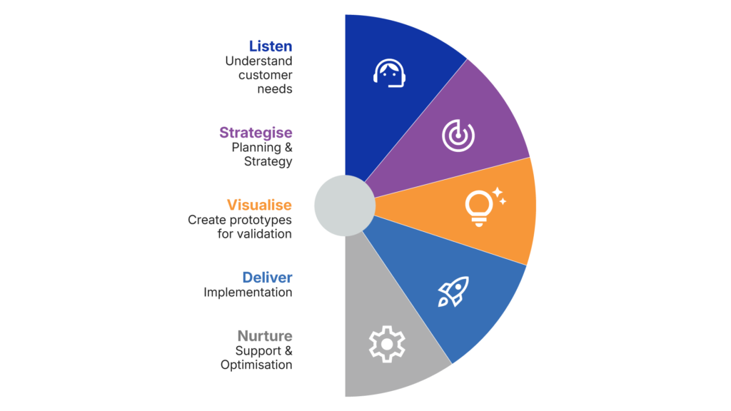Our unique Listen-Strategise-Visualise-Deliver-Nurture methodology ensures alignment between technology and business objectives at every stage. This proven methodology applies across all services, ensuring alignment between technology, UX and business objectives: